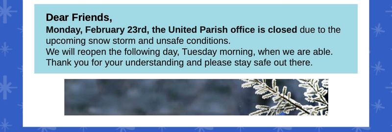 The United Parish has issued the new pledging program. If you are in need of one please call the office and one will be provided to you or you can look here on our website under Stewardship tab and print one out or Click Here to fill out our online Google form.